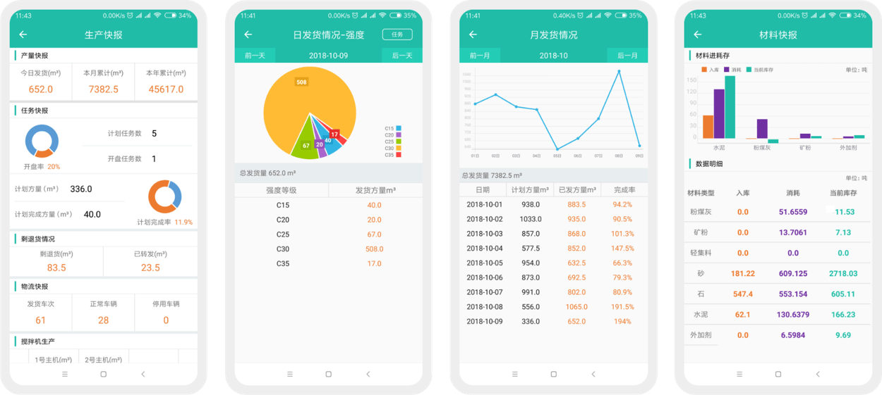 美砼混凝土系统APP版具备销售快报、生产快报、材料快报等智能分析功能,让搅拌站管理者随时随地掌握搅拌站的运营情况。
