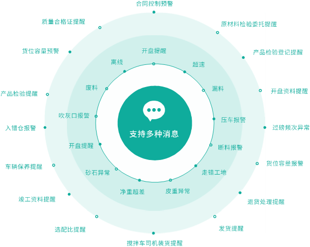 强大的消息流机制:快速定义消息,提醒、预警、报警、控制多种消息类型,PC、APP多端互通,帮助搅拌站控制运营风险。