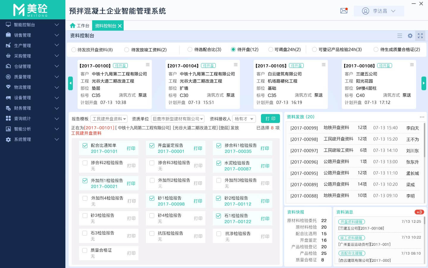 [资料控制台]将发放资料、选配合比、开盘、调盘、登记产品检验、生成质量合格证等试验室相关功能集中到一个智能化界面,提供给资料员、质检员使用。
