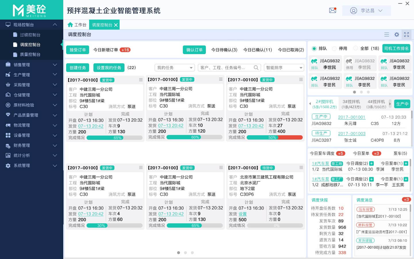 美砼混凝土系统APP版具备临时合同、创建订单、创建任务、货位监控、货位敲仓、搅拌车扫码排队、设备巡检登记等实用功能,内容覆盖销售、生产、采购、仓储、质量、物流、设备、财务等搅拌站全部业务流程,方便搅拌站员工开展移动办公业务。