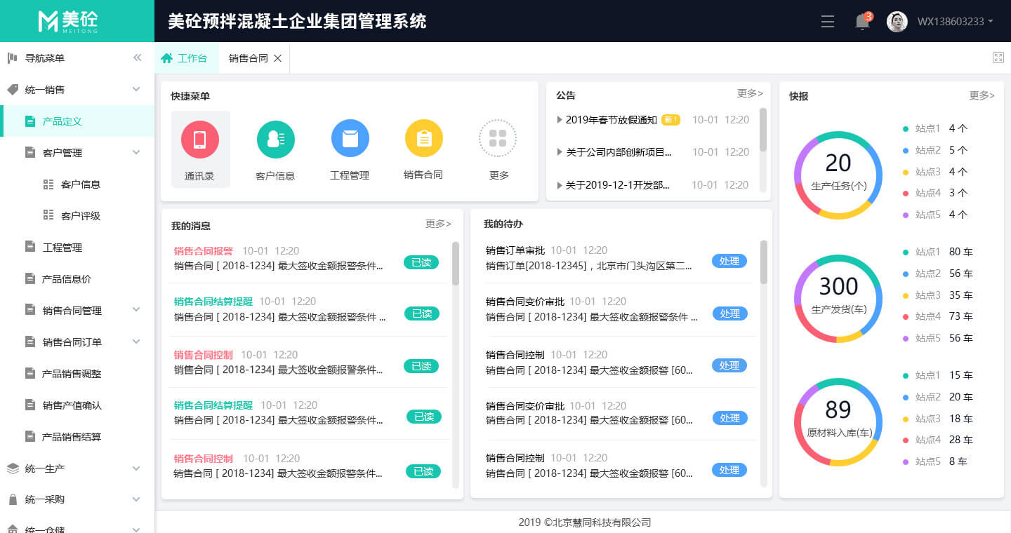 美砼预拌混凝土企业智能管理系统,简称“美砼混凝土系统”,专为混凝土企业定制打造的智能化管理系统,具备PC版与APP版,轻松满足混凝土企业的信息化、智能化、绿色化、移动化、集团化、社会化的运营管理需求,具备智能、连接、整合三大特性: