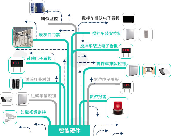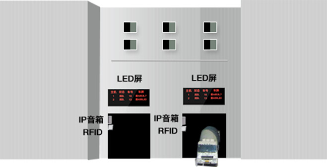 搅拌车装货控制:搅拌车装货控制使用RFID自动识别车辆及IP音箱语音播报,具备引导车辆进入机楼、引导车辆离开机楼、车辆错误进楼报警等消息功能,用以引导车辆装货及防止车辆装错货,避免由于车辆装错货送错工地之后导致一系列的事故。
