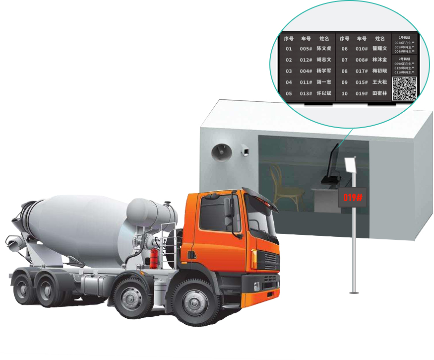 搅拌车排队控制:搅拌车排队控制通过控制搅拌车排队让搅拌车调度更公平有效,支持司机扫码排队、IC卡刷卡排队、RFID识别排队等排队方式。