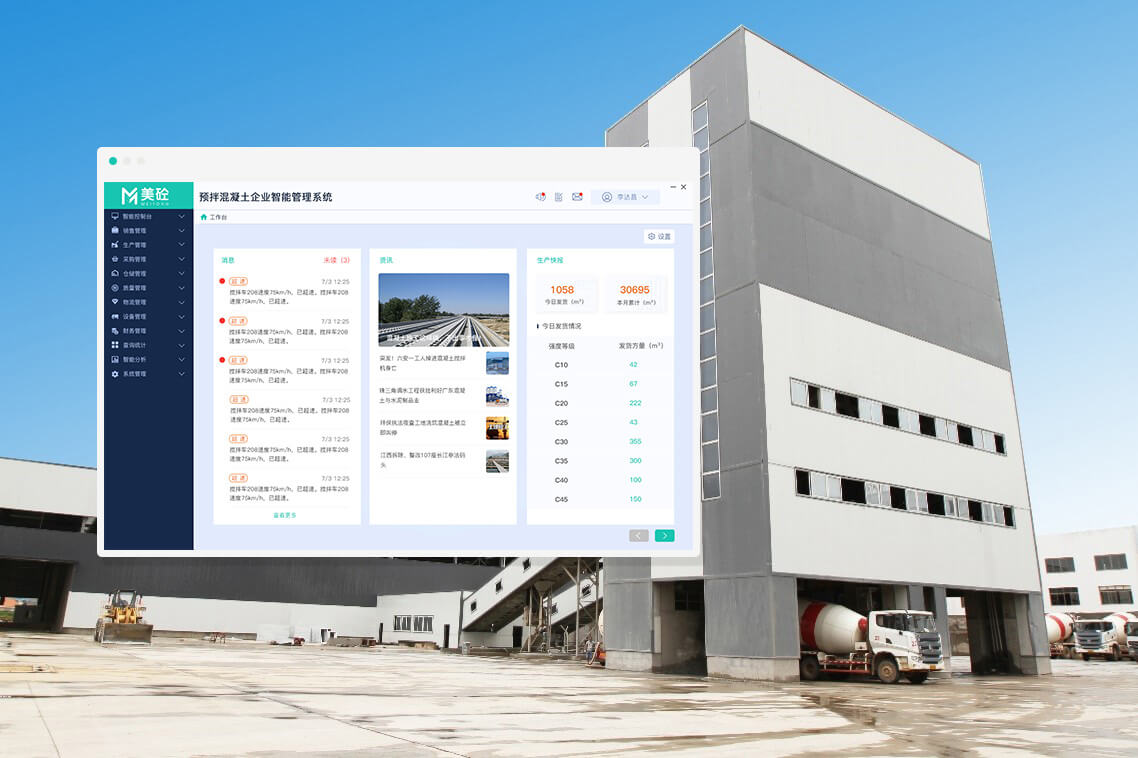 美砼预拌混凝土企业集团管理系统,简称“美砼混凝土集团系统”,专为混凝土集团企业潜心打造的信息化系统,具备PC版与APP版,轻松满足商混集团企业的信息化、智能化、绿色化、移动化、集团化、社会化的运营管理需求。