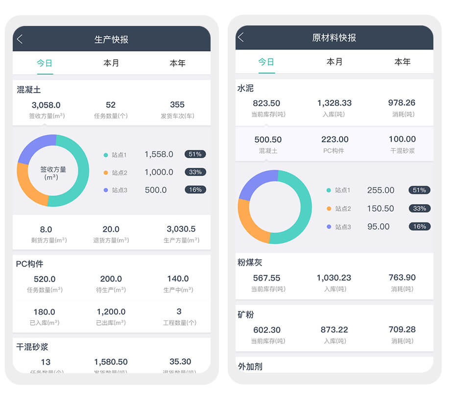 美砼混凝土系统APP版具备销售快报、生产快报、材料快报等智能分析功能,让搅拌站管理者随时随地掌握搅拌站的运营情况。