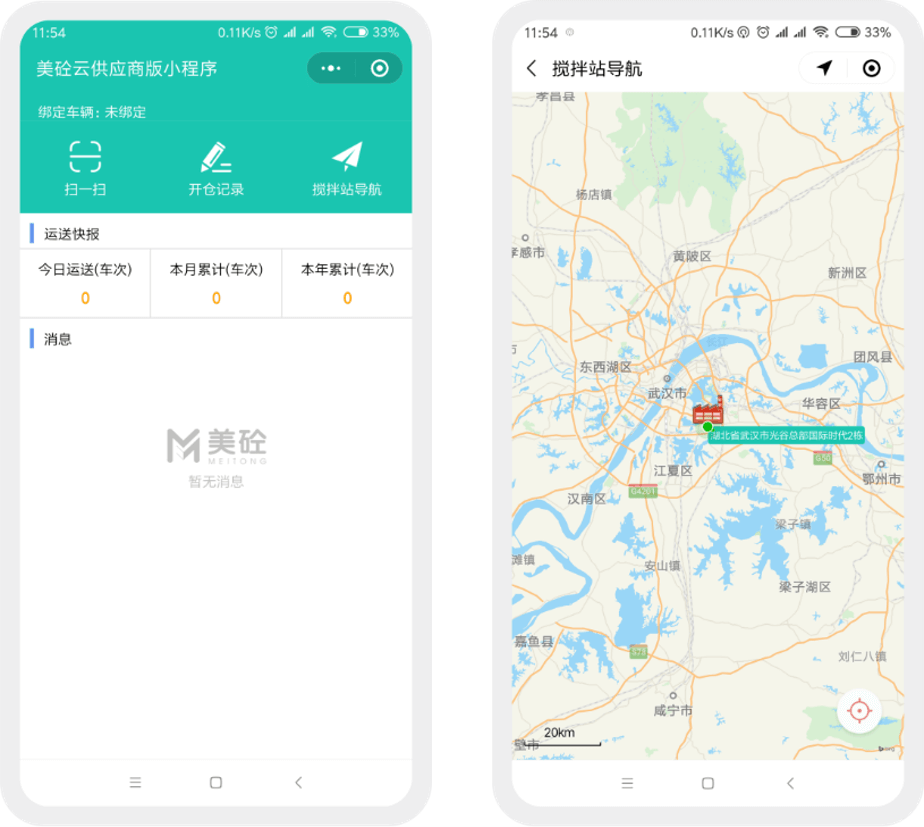 供应商版小程序使供应商参与搅拌站的采购业务,包含司机接收上料指令、司机吹灰口扫码开仓锁、司机搅拌站导航、司机运送统计等功能。