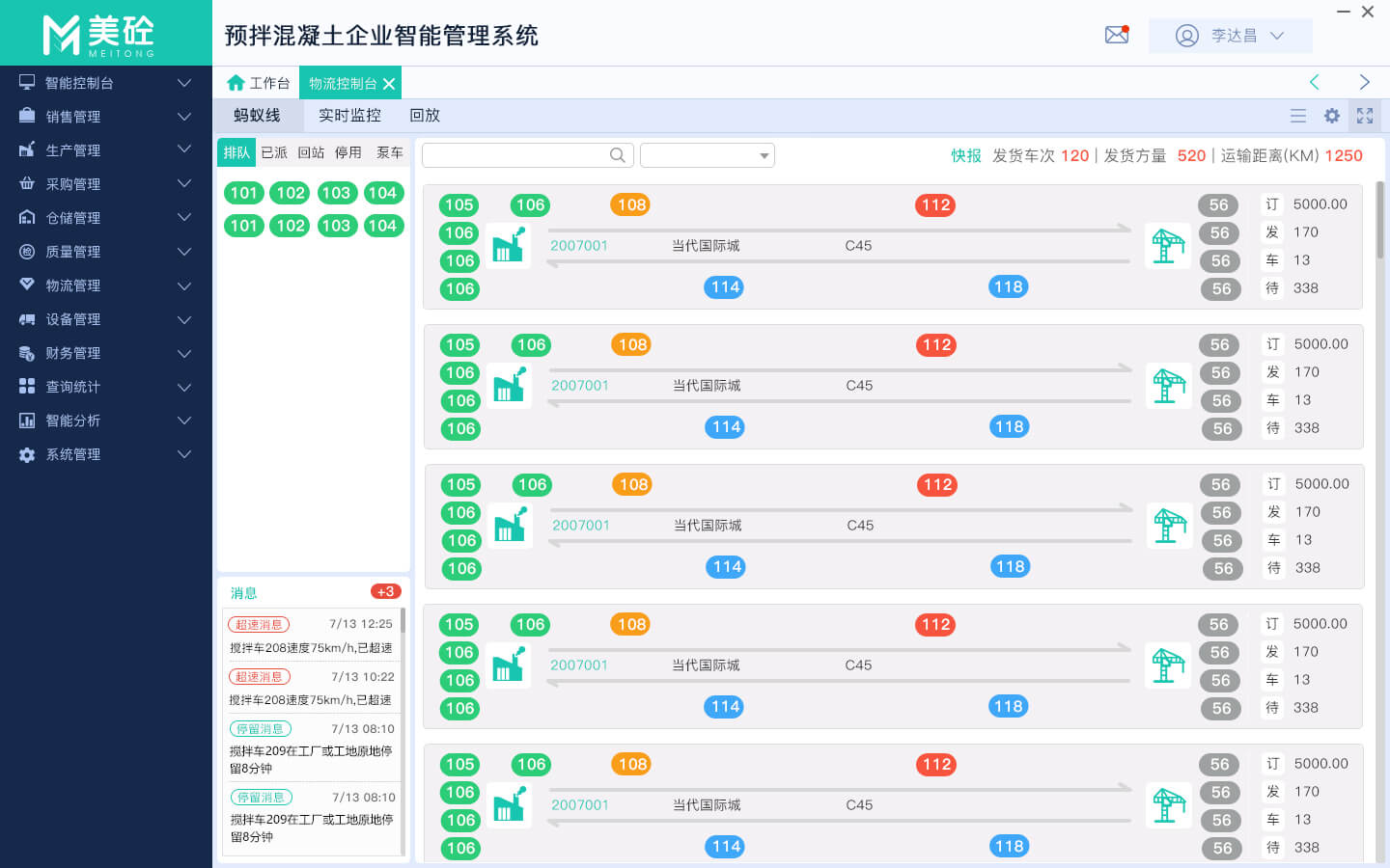 工地发车合理性智能安排、压车断料预警和补救、司机和车辆智能排队、搅拌楼生产智能安排、单站和多站资源计划和调拔、泵送安排、剩退货、多站协同生产物流,可提高物流效率、提升服务质量、降低物流成本。