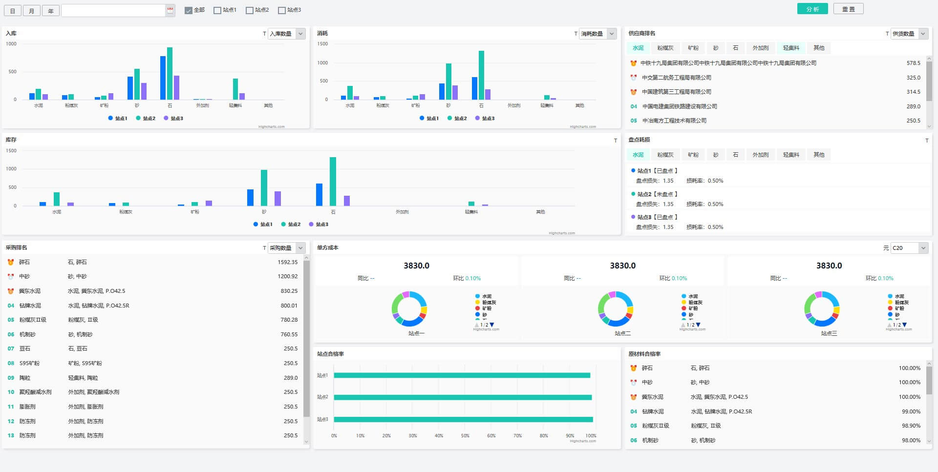 原材料主题分析用于各站点、不同时间段的原材料多维度分析,包括入库、消耗、库存、供应商排名、盘点损耗、单方成本、供应商排名、合格率排名等方面。