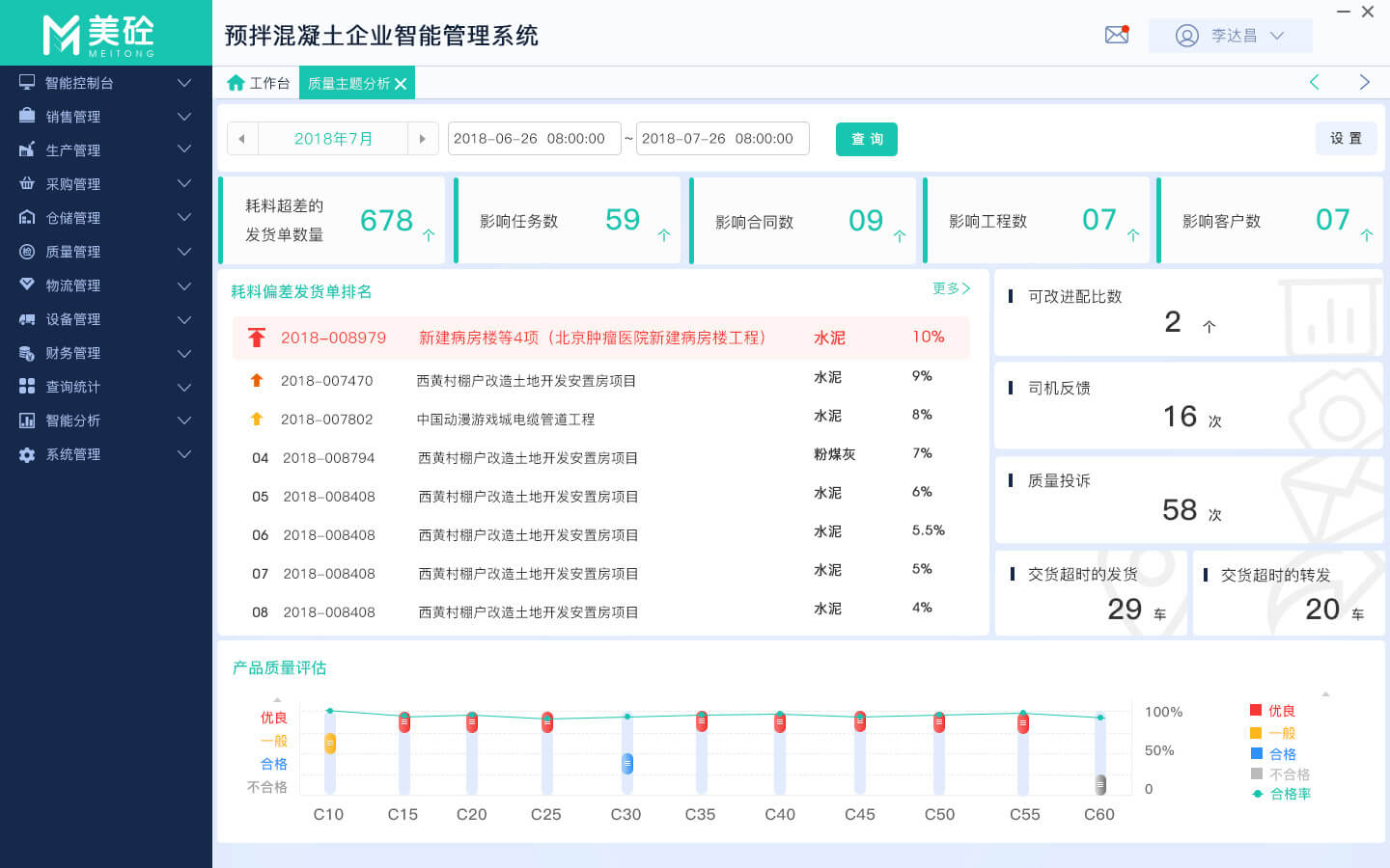 质量主题分析对耗料超差影响、产品质量评估、司机/质量反馈、物流超时、配合比合理性检查进行深度分析,支持按生产任务或发货单溯源。